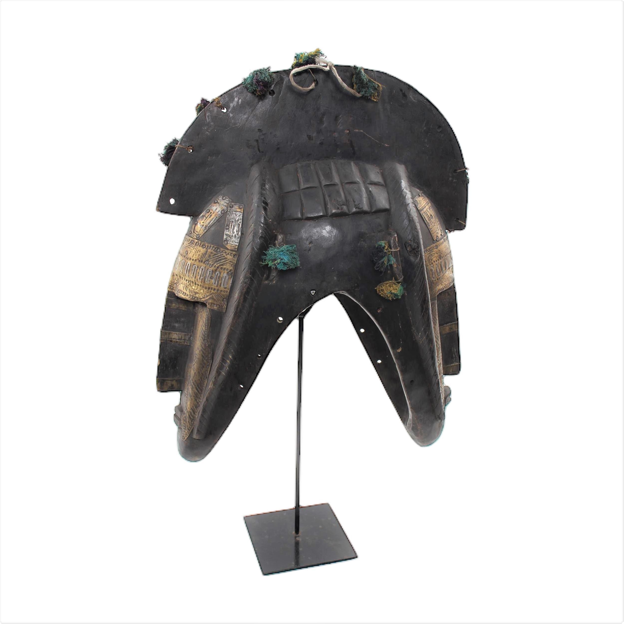 The Marka people are well known for their puppets and masks. They use masks in fishing and farming ceremonies to ensure successful hunt and productive harvest. These masks vary in size and have elongated features, a long nose, a protruding mouth, eyes shadowed by a domed shape forehead, decorated with red fiber tassels on the ears and the head each coated with brass in geometric patterns.