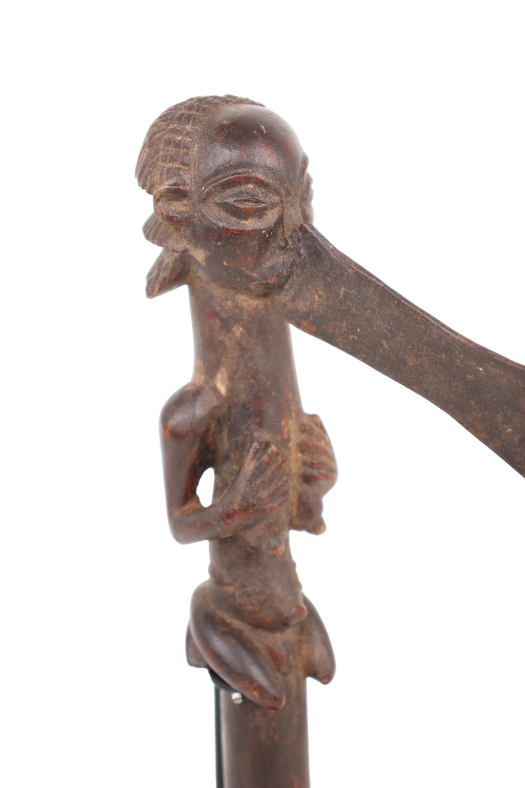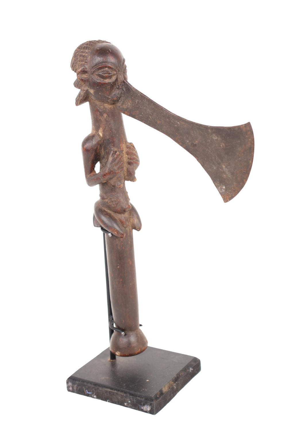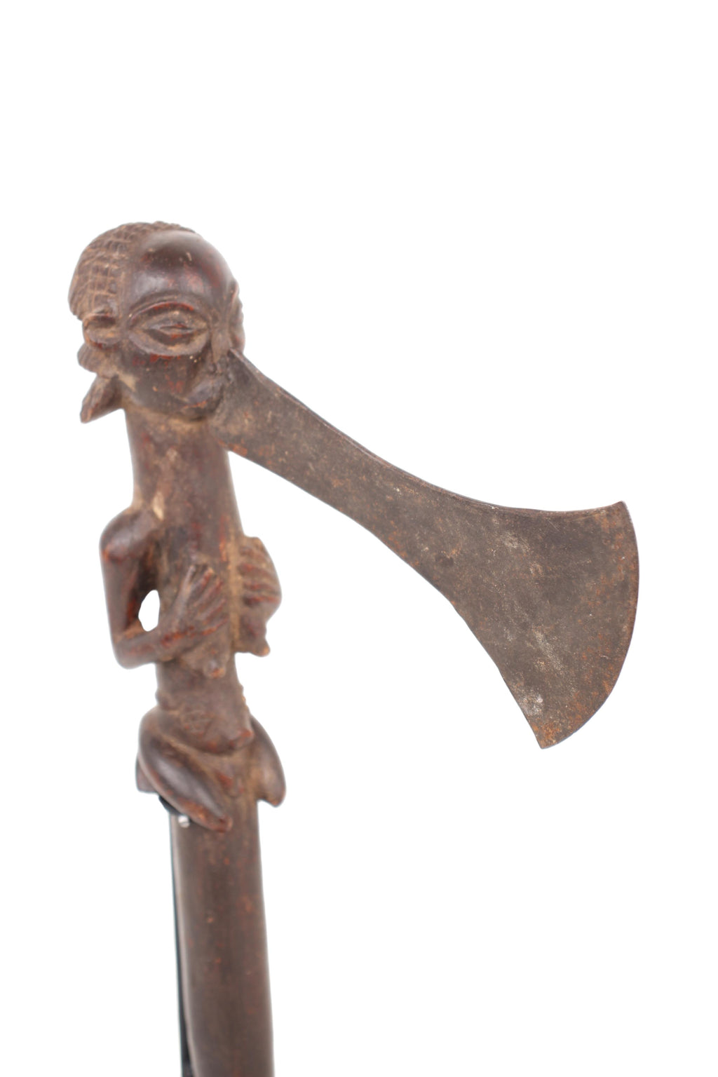 Luba/Baluba Tribe Wooden Axe – The Luba tribe, primarily located in the Democratic Republic of Congo, is known for its rich cultural heritage and craftsmanship. Almost all Luba art includes the female form either surmounting or supporting objects such as headrests, staffs, spears, axes or bowls. These traditional carvings serve various purposes, including ancestor and spirit worship, initiation rites and divination ceremonies. The predominant theme in Luba sculpture is the representation of women, reflecting the mythological significance of Vilie, considered the first woman spirit, founder of the clan and symbol of fertility and lineage preservation.