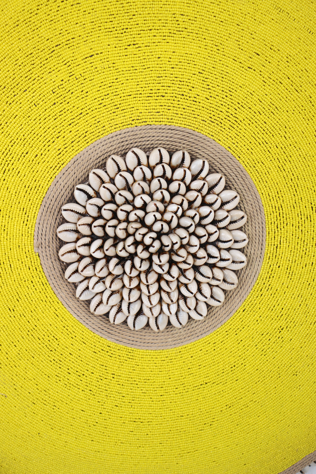 Tikar Tribe Beaded Shield – These oval-shaped beaded shields are traditional shields created by the Tikar people. These shields serve both functional and cultural purposes within Tikar society. The oval shape is a distinctive feature of Tikar shields. They are hand carved from a single piece of wood and decorated with a combination of beads, cowrie shells, and a manilla string. Tikar shields are known for their intricate and detailed carvings. The surface of the shield is often adorned with symbolic patterns, geometric motifs, or representations of animals and mythological creatures. These carvings hold cultural significance and may convey messages about the wearer's identity, status, or clan affiliation. The shields are designed to be lightweight and portable.