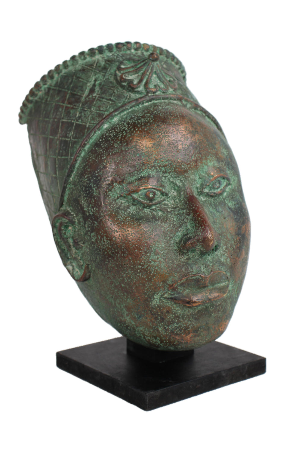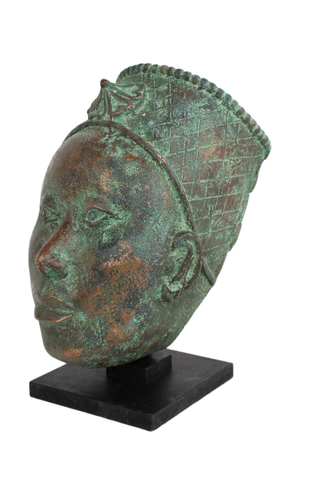 Yoruba Tribe Ife Bronze Head Sculpture – Ife head sculptures are among eighteen bronze combination figures that were uncovered in 1938 at Ife in Nigeria. Ife, also known as The Kingdom of Ife, is a religious Yoruba City and historic royal center of the Yoruba people in modern-day Osun State, Nigeria's southwestern region. Ife's artists began creating a polished and extremely naturalistic sculptural tradition in stone, terracotta, brass, and copper works made using the cire perdue method (lost-wax) in the late 12th or early 13th century and established a style unlike anything else in Africa at the time. The Yoruba believed that the Ase, or inner strength and spirit of a person, resided in the head, hence important people were frequently represented with big heads.