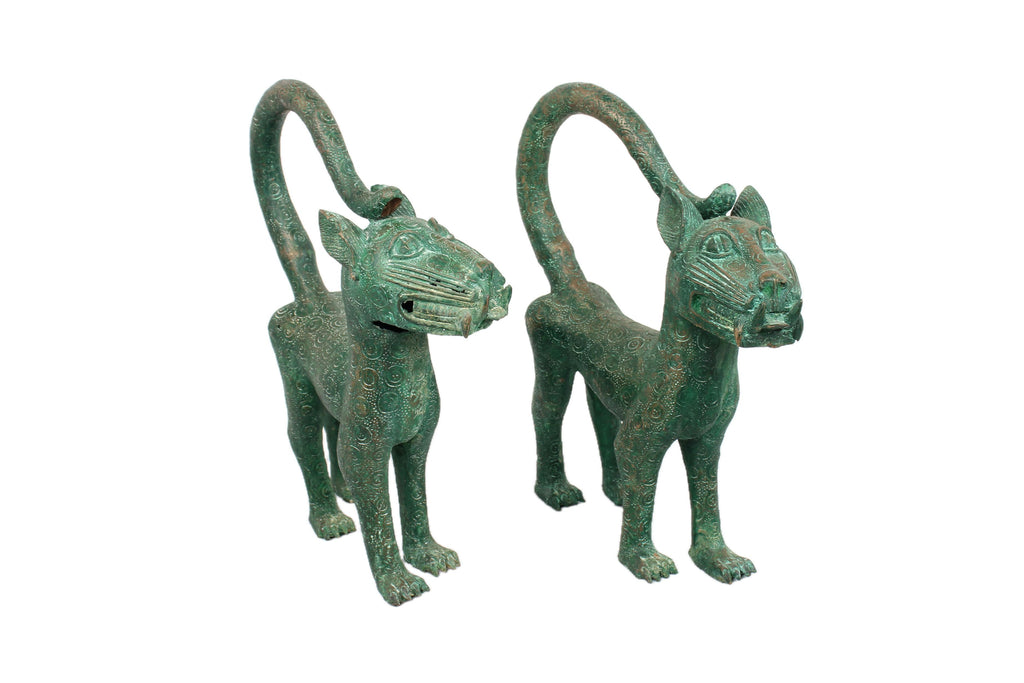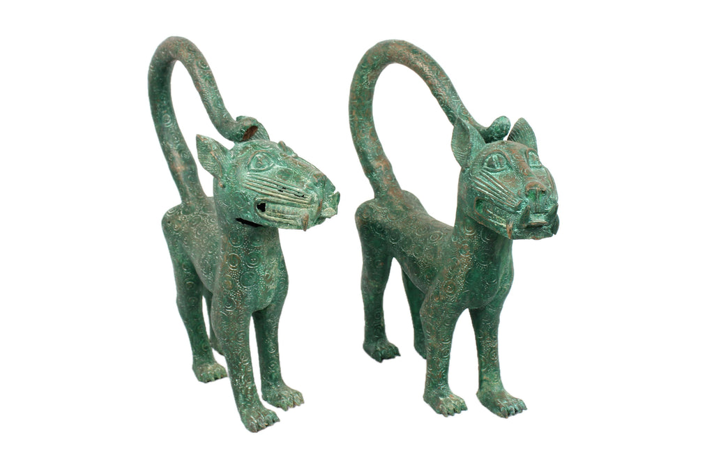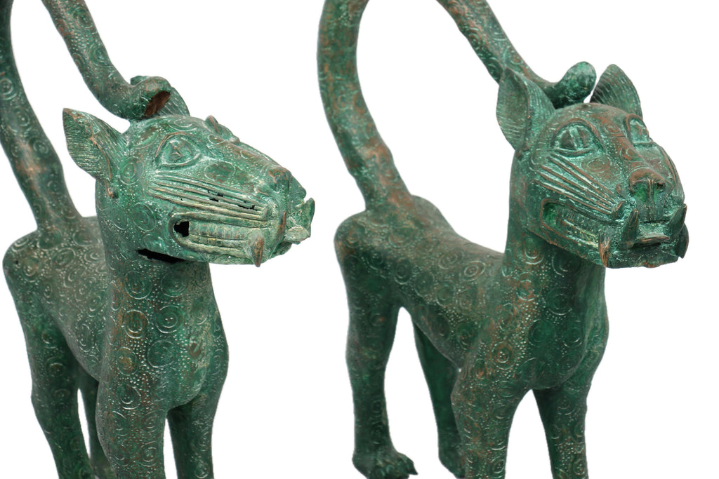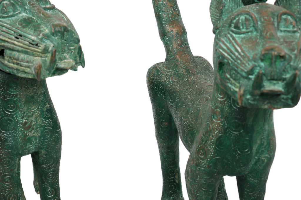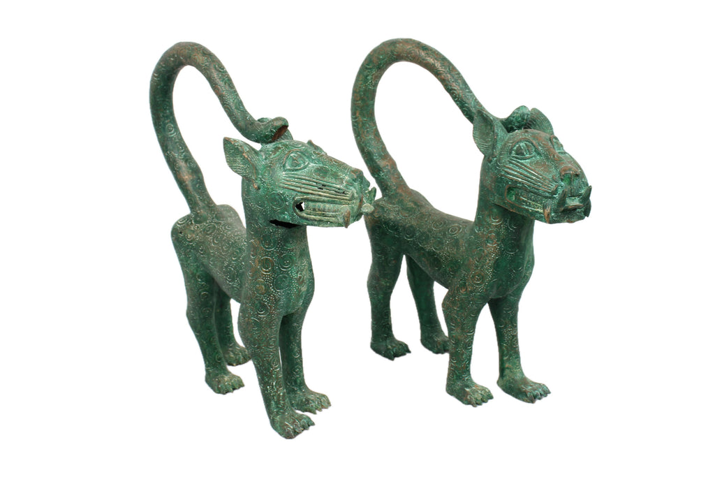 Edo Tribe Benin Bronze Leopard – These bronze leopard sculptures were created by the Edo people of the ancient Kingdom of Benin in southern Nigeria and were placed on royal altars or used as royal water vessels. The leopard is a symbol of regal authority. In the early 14th century, the Benin Kingdom was established in what is now Southern Nigeria. This Kingdom is known for their bronze cast sculptures known as the Benin Bronzes, a group of sculptures dating from the late 13th or early 14th century that include elaborately decorated brass plaques, commemorative heads, animal and human figures, items of royal regalia, and personal ornaments.