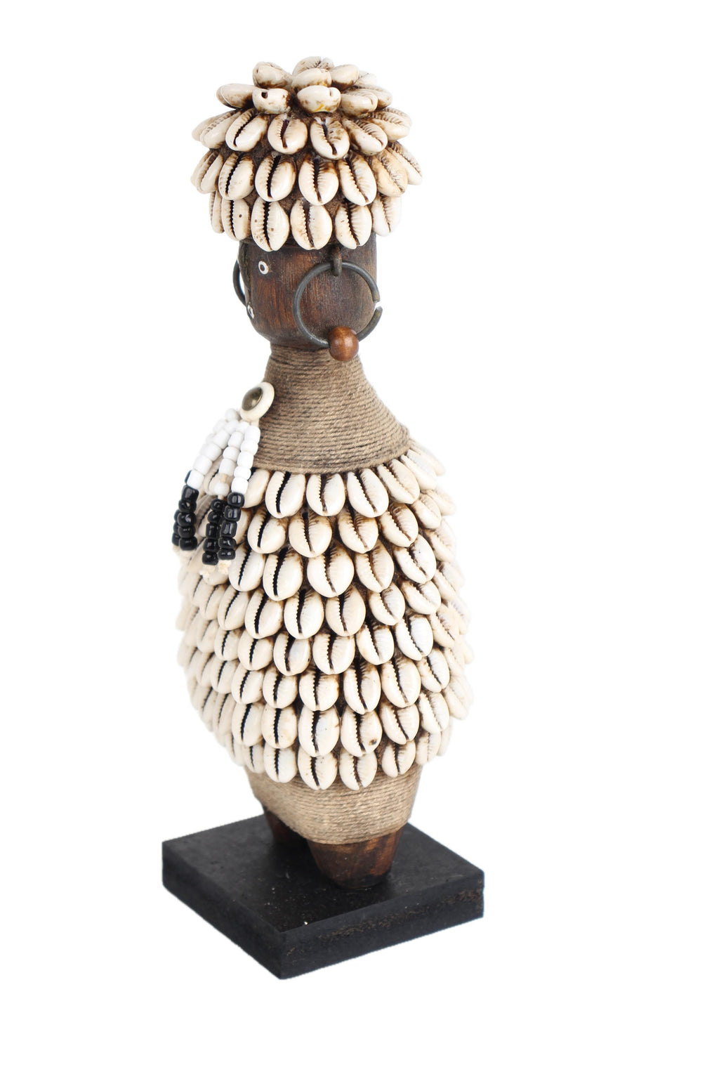Namji Tribe Dolls – Namji Dolls come from the Namji tribe in Cameroon's northwestern region. These handcrafted dolls are rounded geometric shapes and are embellished with cowrie shells and multi-colored beads. These are given to brides during their wedding ceremony. According to the Namji, these dolls bring good fortune and protect against evil spirits. Namji dolls are collectible art works that come in a variety of sizes and shapes.