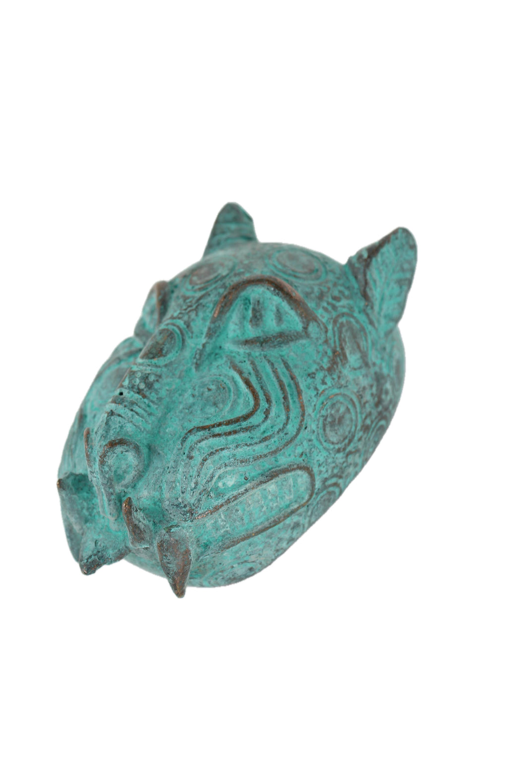 Edo Tribe Benin Bronze Leopard Head – These bronze leopard sculptures were created by the Edo people of the ancient Kingdom of Benin in southern Nigeria and were placed on royal altars or used as royal water vessels. The leopard is a symbol of regal authority. In the early 14th century, the Benin Kingdom was established in what is now Southern Nigeria. This Kingdom is known for their bronze cast sculptures known as the Benin Bronzes, a group of sculptures dating from the late 13th or early 14th century that include elaborately decorated brass plaques, commemorative heads, animal and human figures, items of royal regalia, and personal ornaments.