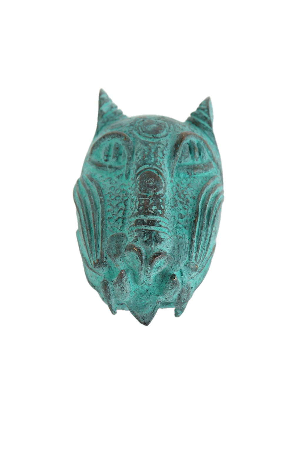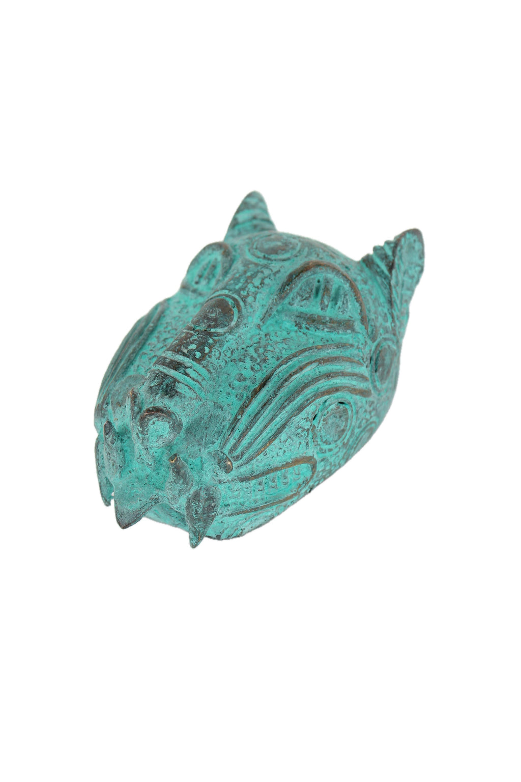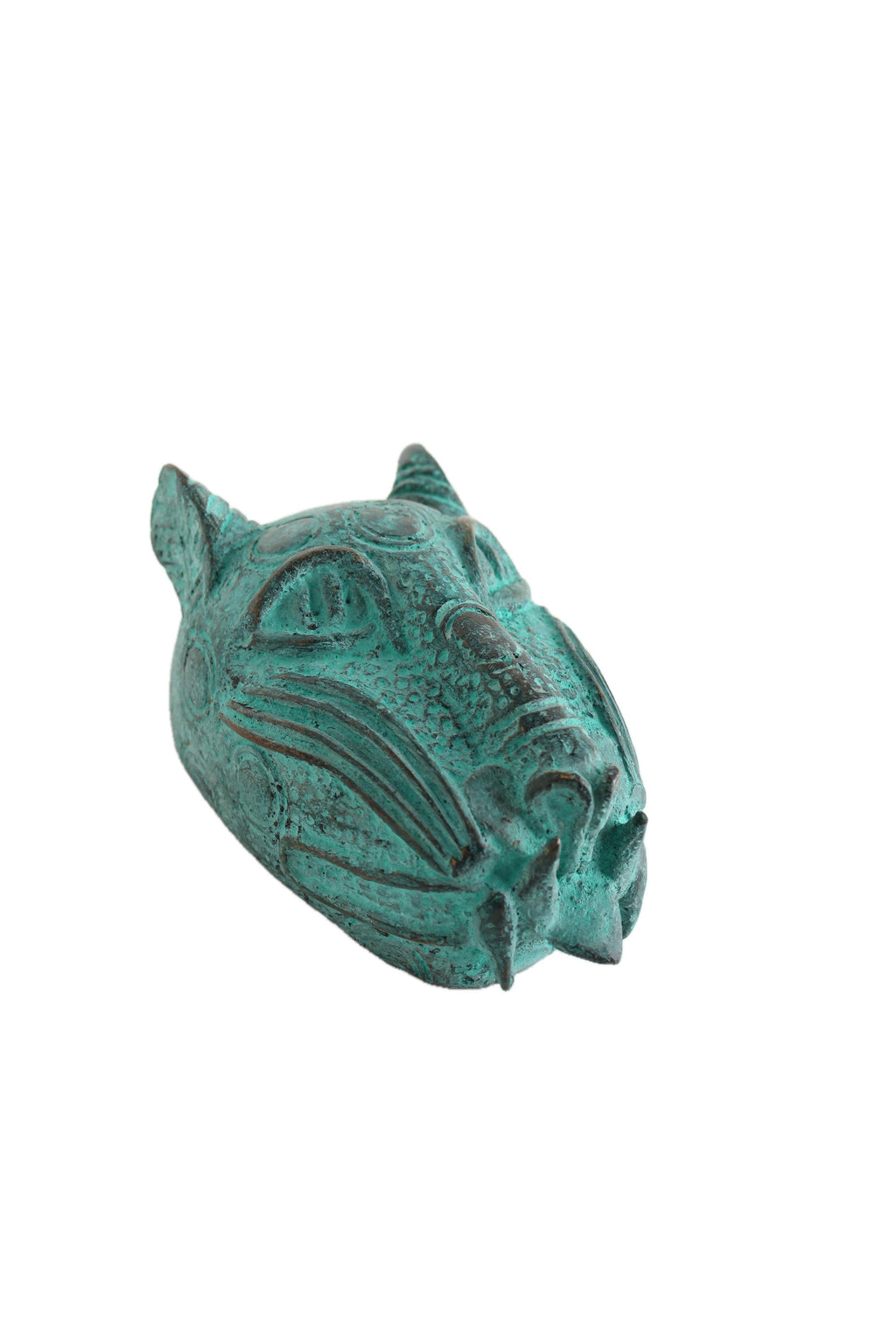Edo Tribe Benin Bronze Leopard Head – These bronze leopard sculptures were created by the Edo people of the ancient Kingdom of Benin in southern Nigeria and were placed on royal altars or used as royal water vessels. The leopard is a symbol of regal authority. In the early 14th century, the Benin Kingdom was established in what is now Southern Nigeria. This Kingdom is known for their bronze cast sculptures known as the Benin Bronzes, a group of sculptures dating from the late 13th or early 14th century that include elaborately decorated brass plaques, commemorative heads, animal and human figures, items of royal regalia, and personal ornaments.