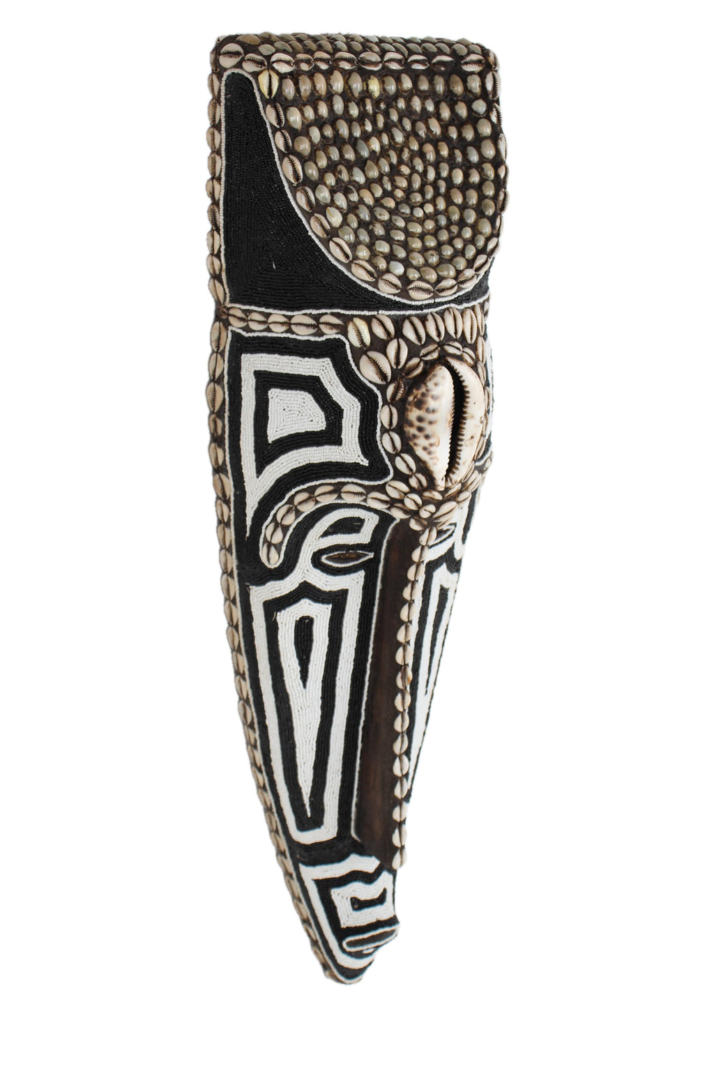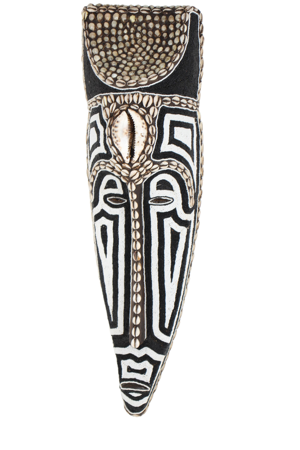 Fang Tribe Beaded Mask – This mask is created by the Fang people of Gabon, Equatorial Guinea, and Cameroon. It is typically carved from wood and painted white, often with black or red geometric patterns and often lately glass beads adorning the surface. The white color symbolizes purity, light, and the spirit world, while the contrasting patterns may represent various meanings or spiritual forces. The mask is usually used during rites of passage initiation ceremonies by the Ngil secret society. The Ngil secret society is a powerful initiation and enforcement group within the Fang community. The society's primary role is to maintain social order, administer justice, and protect against witchcraft and malevolent spirits. The purpose for this mask is to strike fear into wrongdoers and to identify individuals accused of crimes or transgressions within the community.