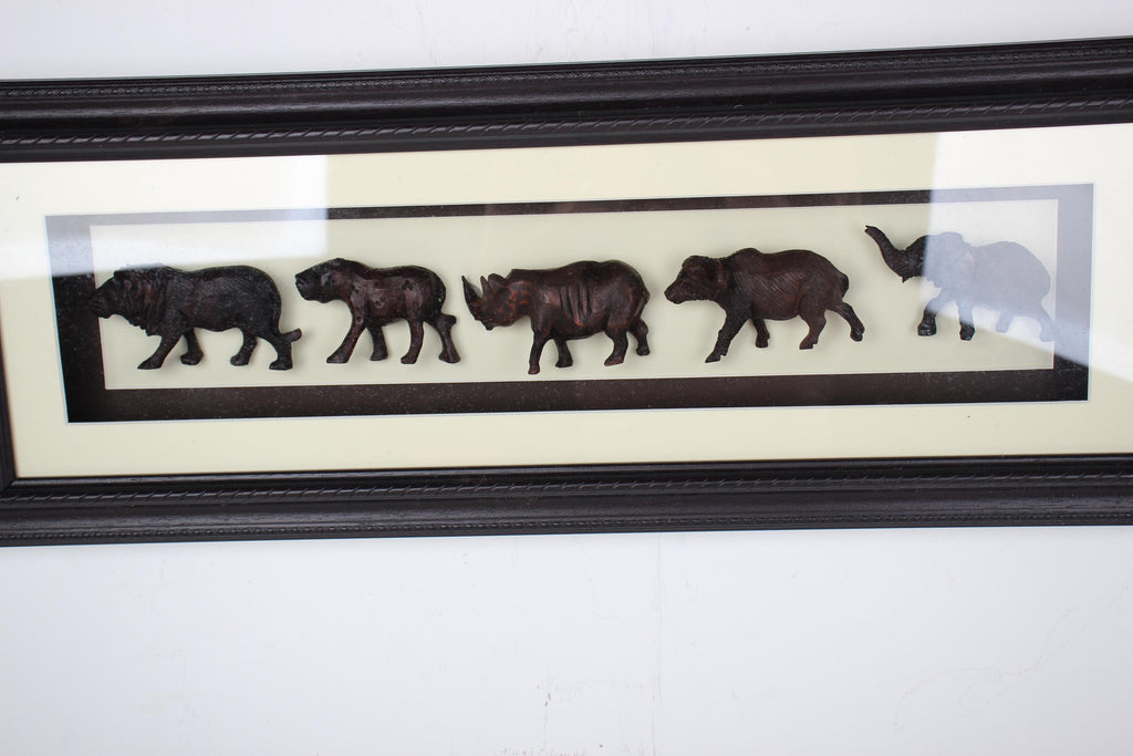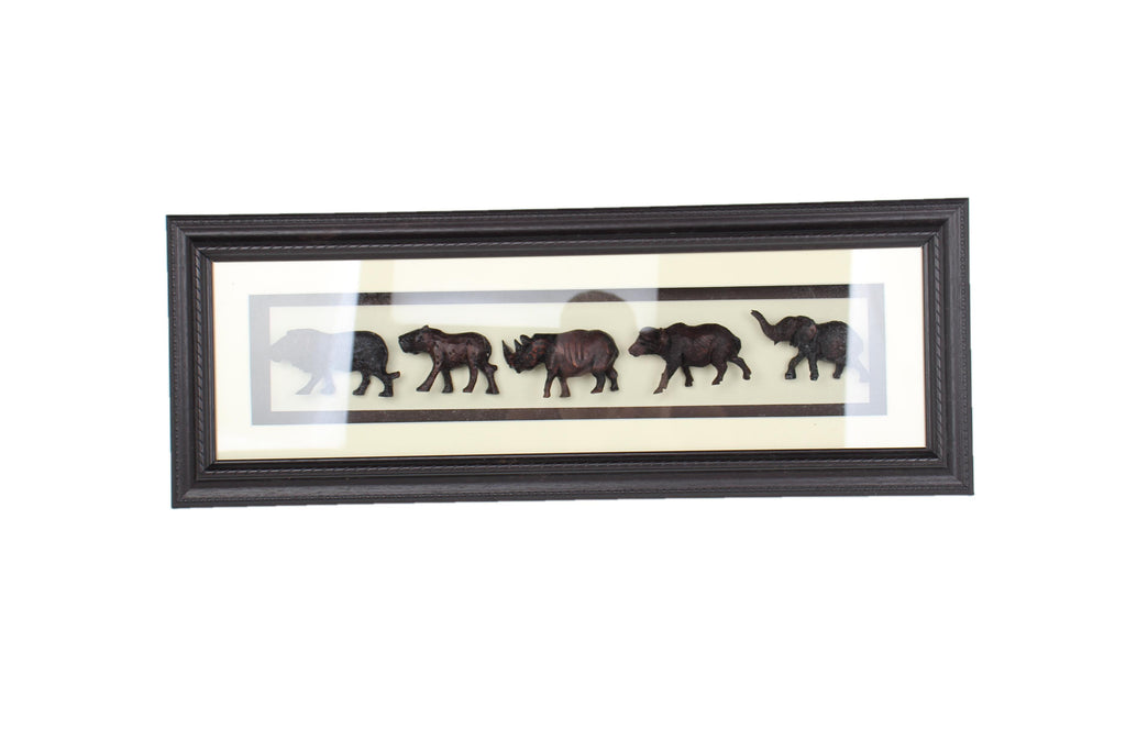Chichewa Tribe Big Five Safari Sculptures Shadow Box – These sculptures feature Africa's "Big Five" safari animals: the African Lion, African Leopard, Cape Buffalo, African Elephant, and African Rhinoceros have been hand carved by the Chichewa people of Malawi and surrounding regions. Carefully shaped from a single piece of wood, the craftsmanship reflects both artistic skill and cultural meaning in Chichewa society.