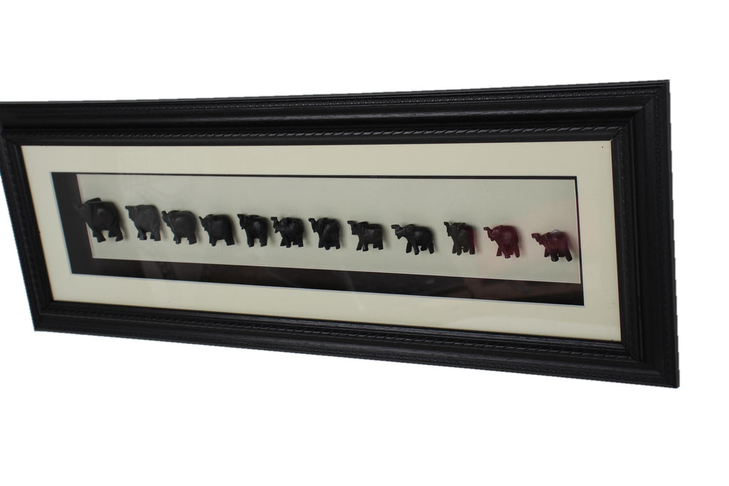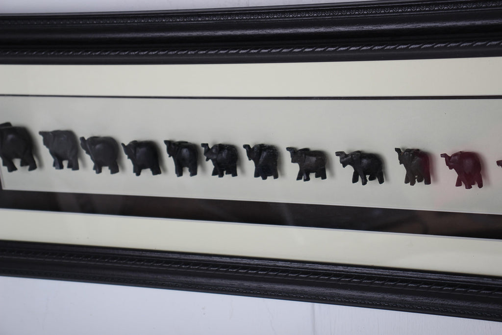 Chichewa Tribe Wooden Elephant Family Shadow Box – These elephant sculptures in a shadow box frame have been hand carved by the Chichewa people of Malawi and surrounding regions. In Chichewa tradition, the elephant represents strength, wisdom and leadership. Carefully shaped from a single piece of wood, the craftsmanship reflects both artistic skill and cultural meaning, honoring the animal's majesty while embodying the values of dignity and respect in Chichewa society.